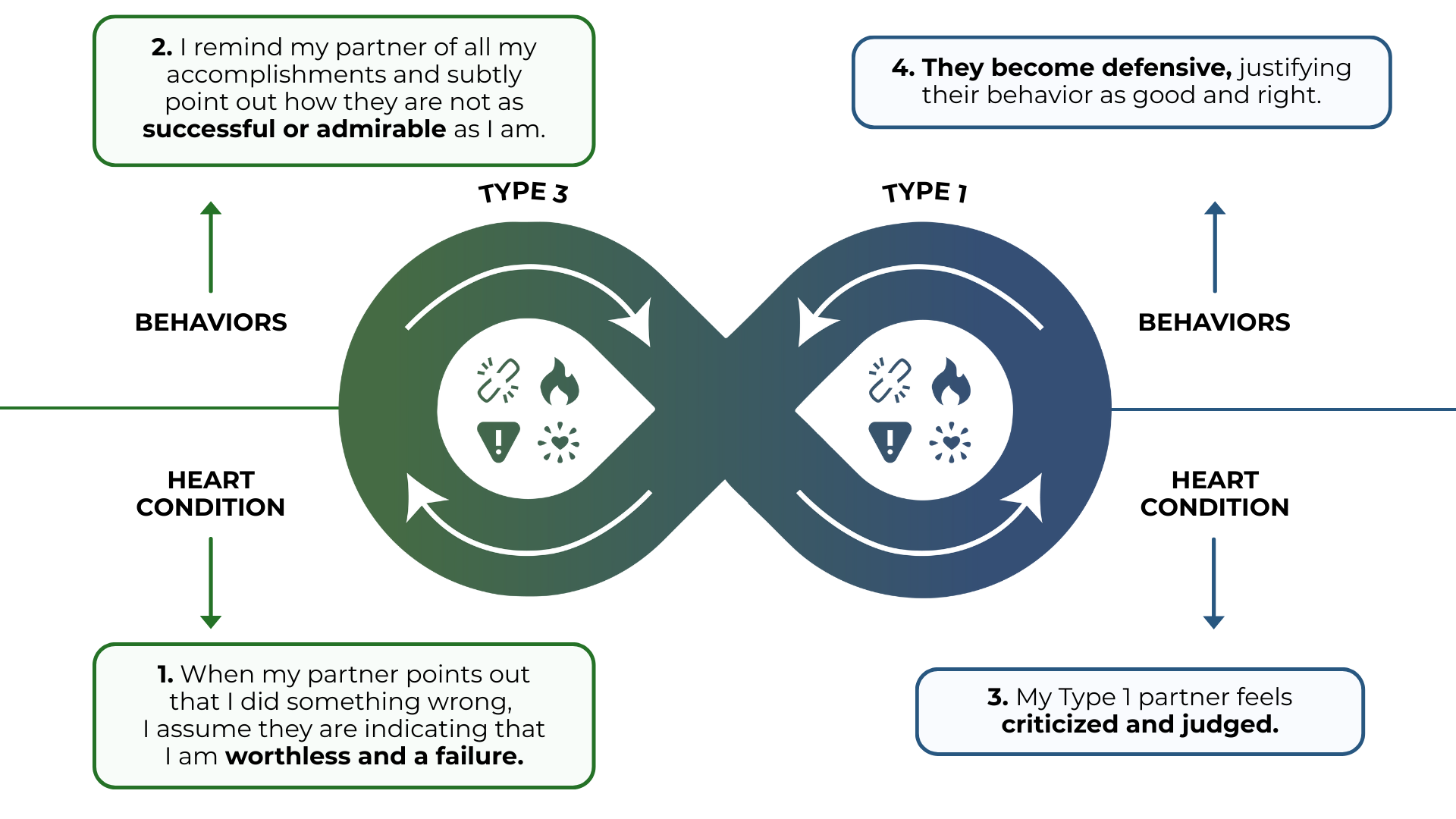 - Criticism vs. Image: Type 1 may unintentionally criticize what Type 3 sees as an accomplishment, while Type 3 may gloss over what Type 1 sees as important.
