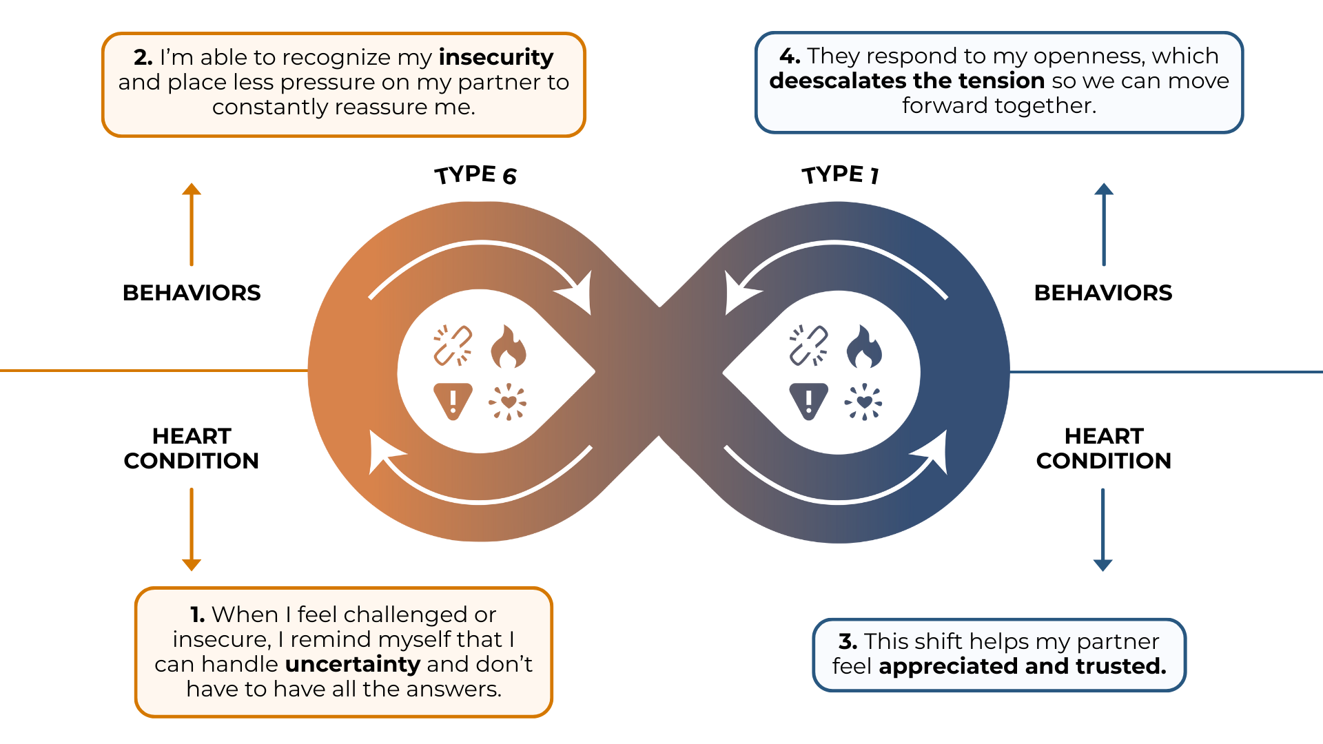 The good news? A Type 1 + Type 6 relationship can flourish when both partners offer reassurance, space, and respect for each other’s process.