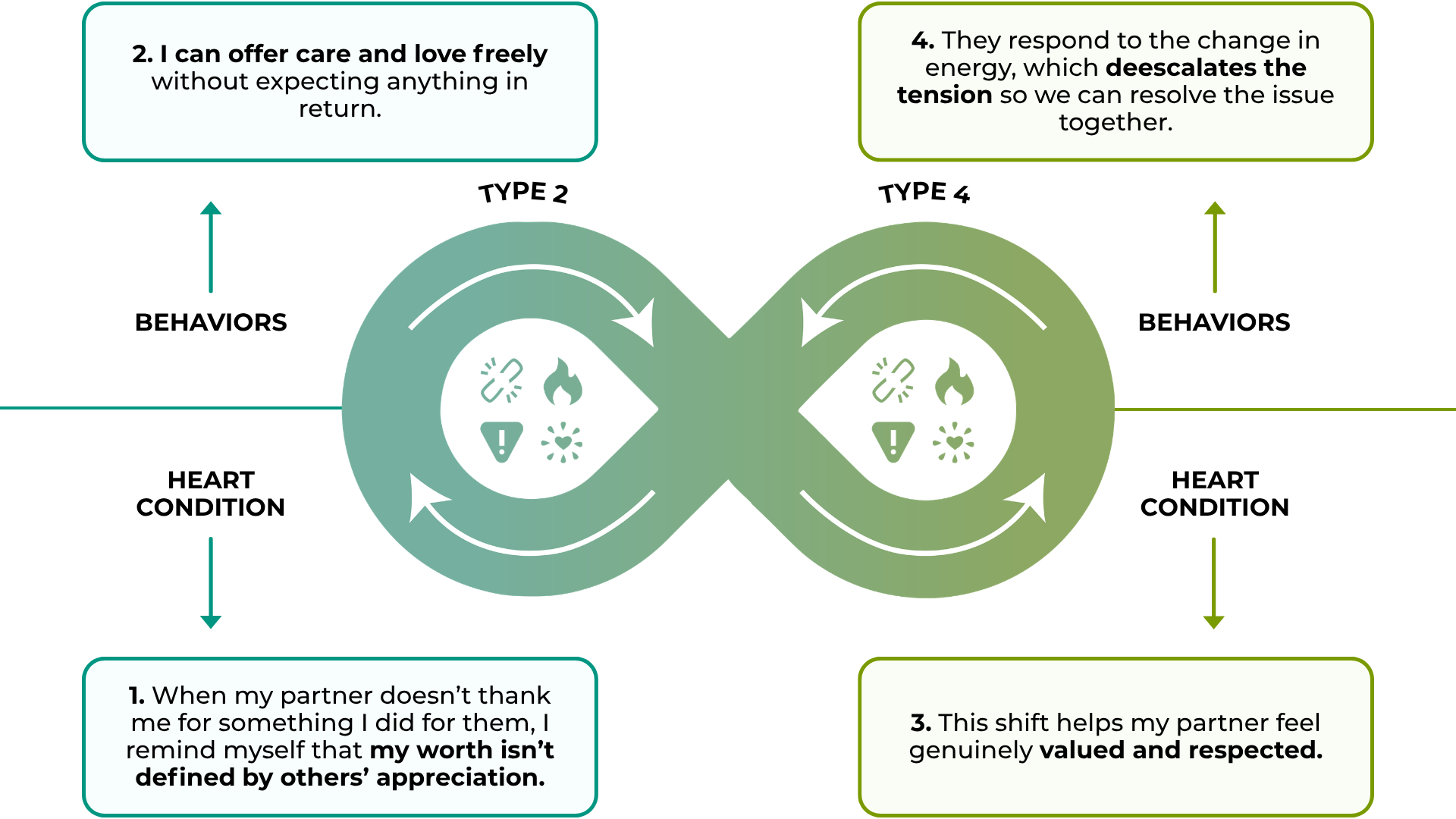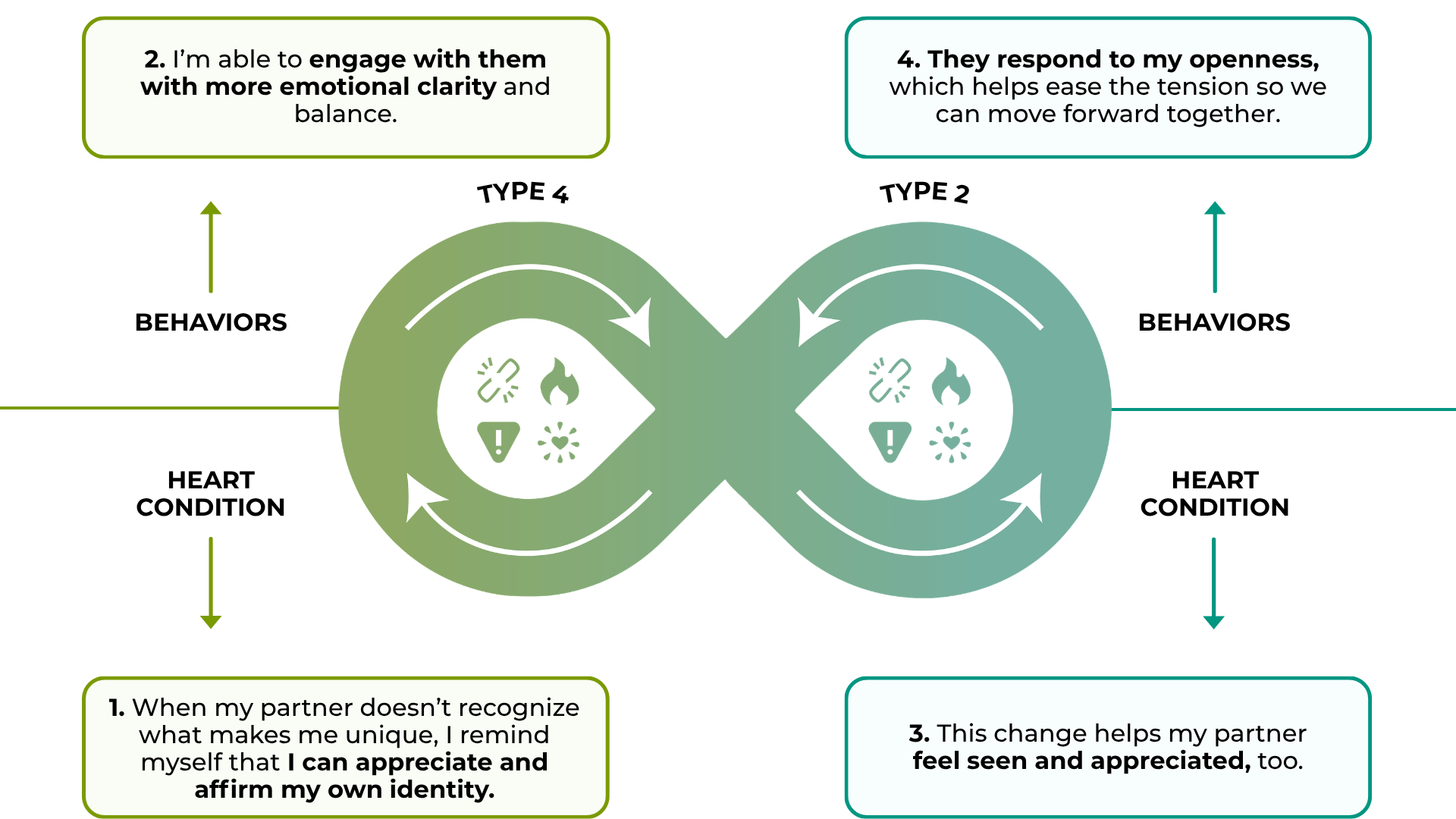But when we become more aligned with who we are and grow in self-awareness, the dynamic shifts. Here is an example of an aligned dance for Type 2 and Type 4: