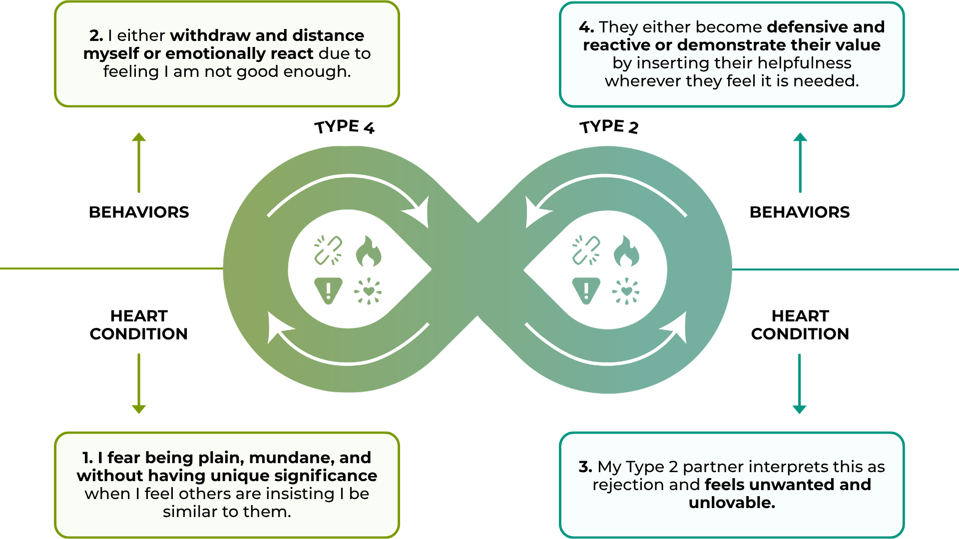 Type 4's may retreat into their emotions, feeling that the 2’s help doesn’t fully meet their deeper longing for true understanding.