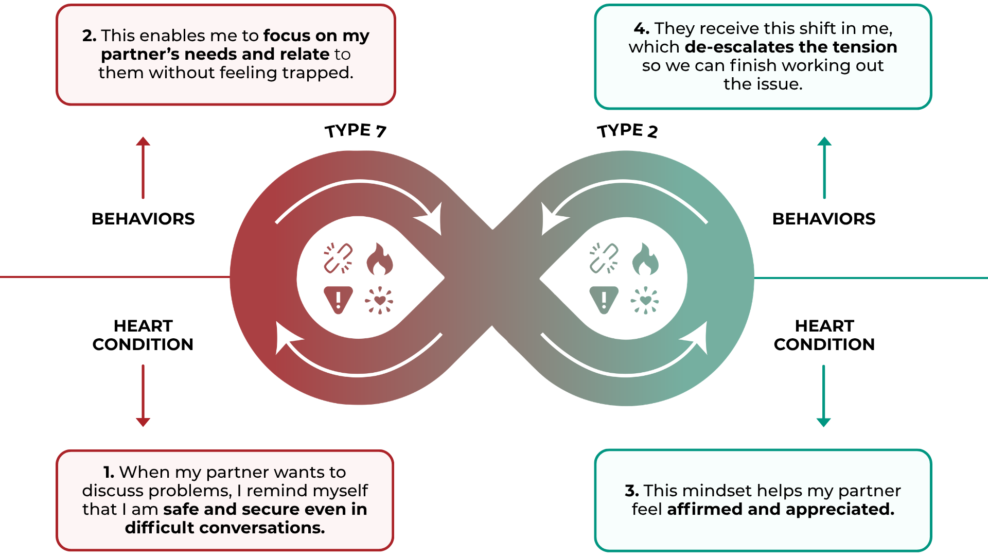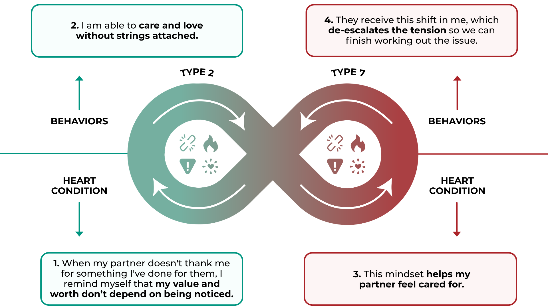 But when we become more aligned with who we are and grow in self-awareness, the dynamic shifts. Here is an example of an aligned dance for Type 2 and Type 7: