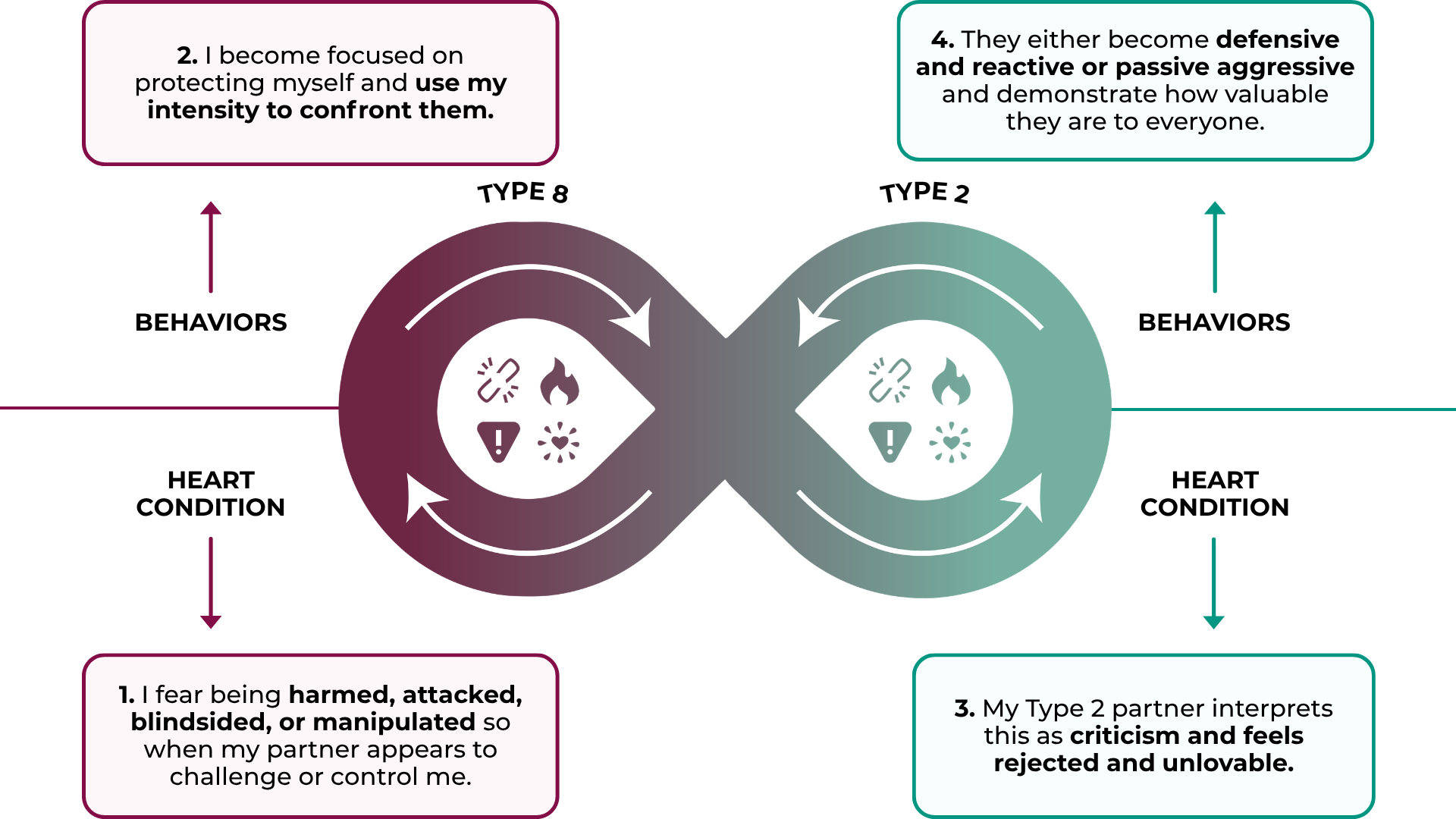 - Recognize intensity patterns: Type 2's may over-give to feel loved, while Type 8's may dominate to feel safe. Awareness allows them to shift from reacting to connecting.
