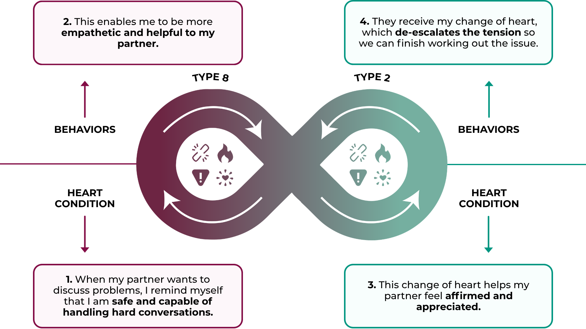 - Respect each other’s pace: 2's may want to process feelings longer, while 8's want a quick resolution. Find a middle ground.