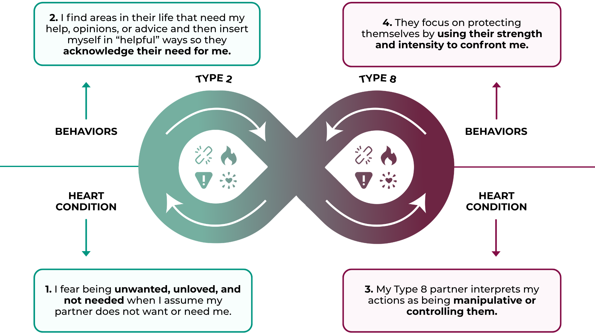 This unconscious pattern—giving to gain closeness (2) and guarding against dependence (8)—can create cycles of tension, power struggles, and emotional disconnection.