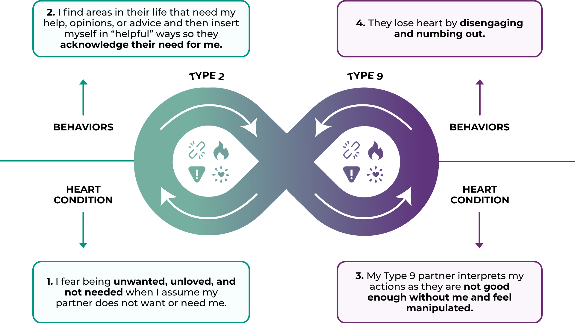 - Recognize the cycle of over-giving and avoidance. 2's may give excessively to feel needed, while 9's may avoid asserting themselves. Awareness breaks this loop.