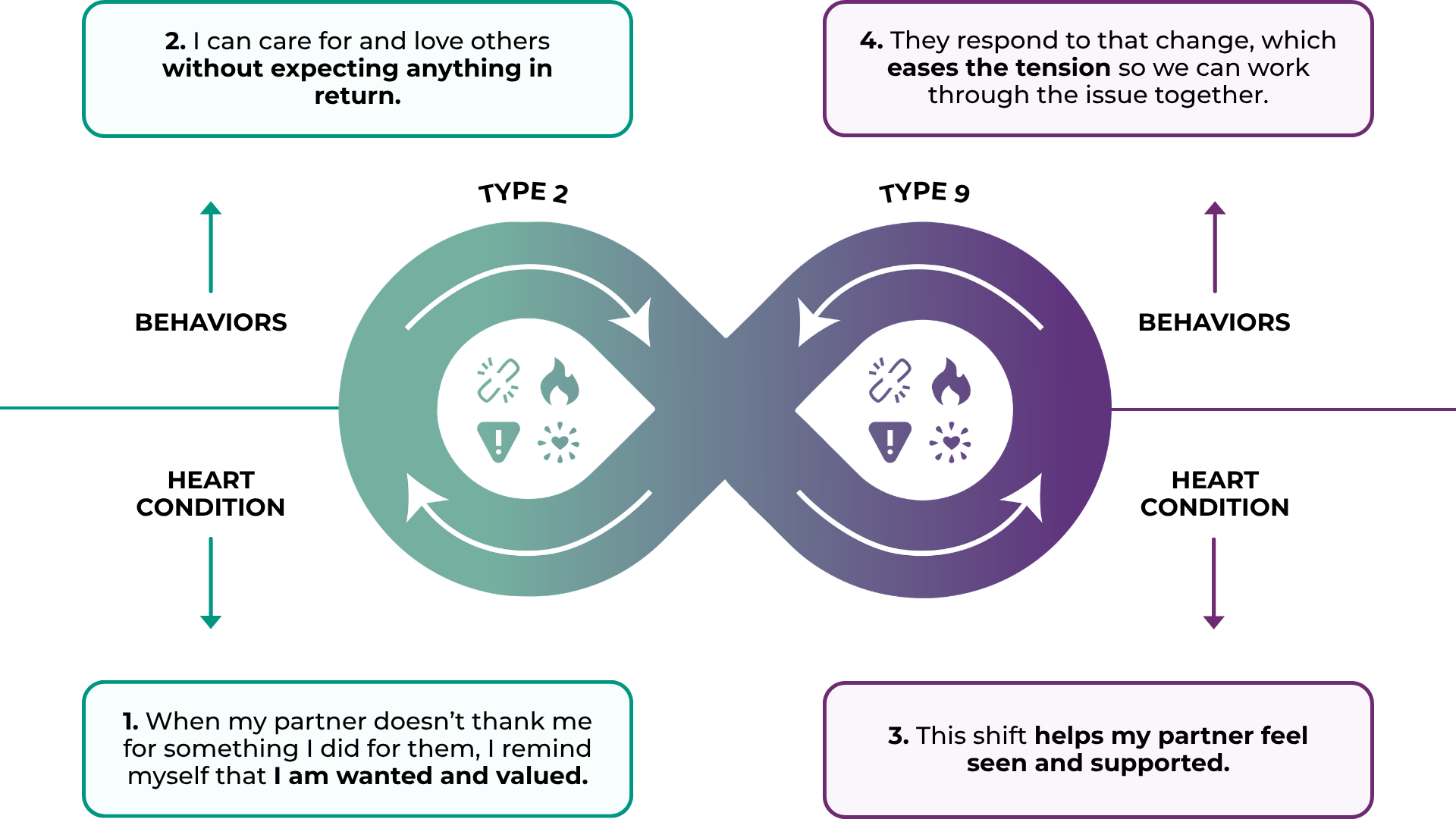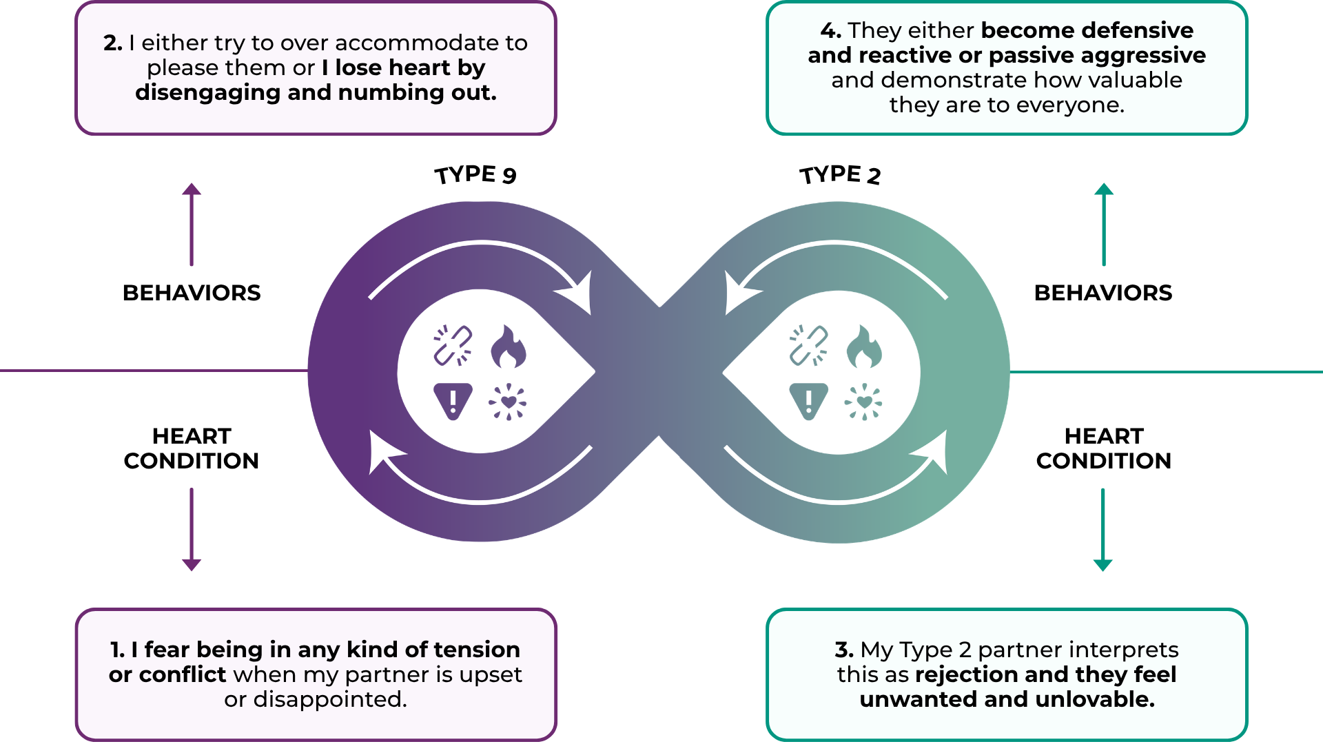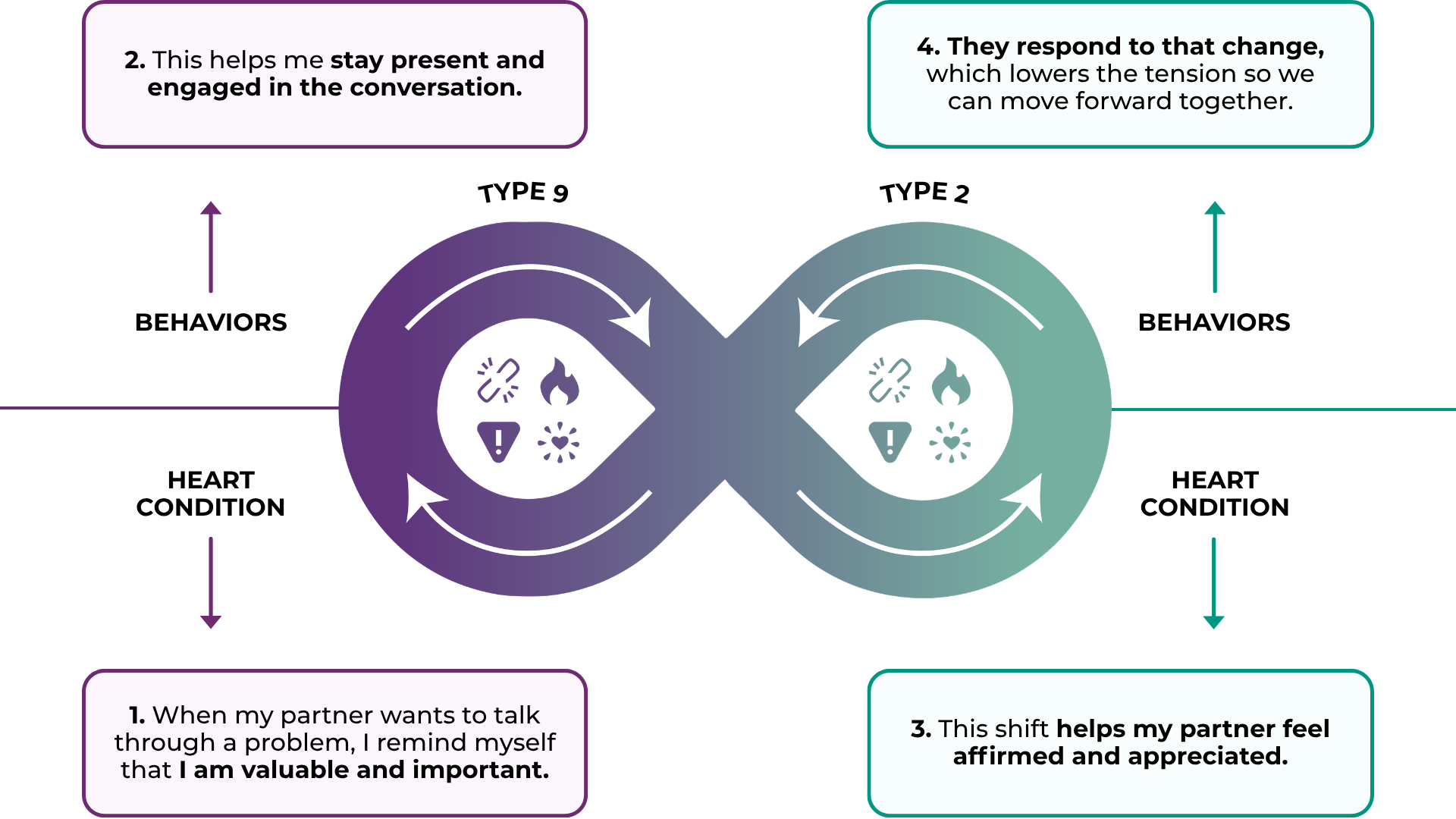 We created the Dance to show the relational dynamics between two Enneagram types.