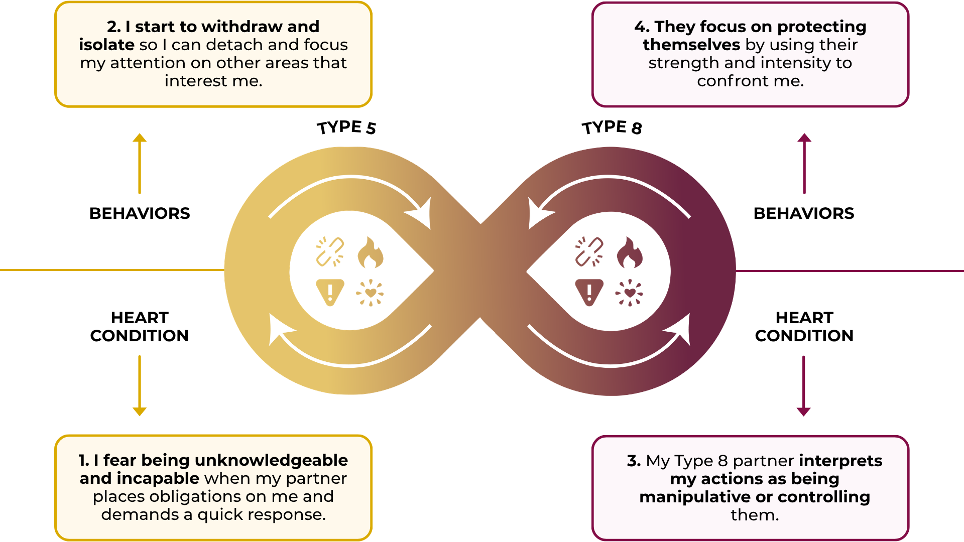 - Clashing Needs: Type 5's crave space and observation, while Type 8's crave engagement and action. Without awareness, this can leave the Type 5 feeling pressured and the Type 8 feeling frustrated.