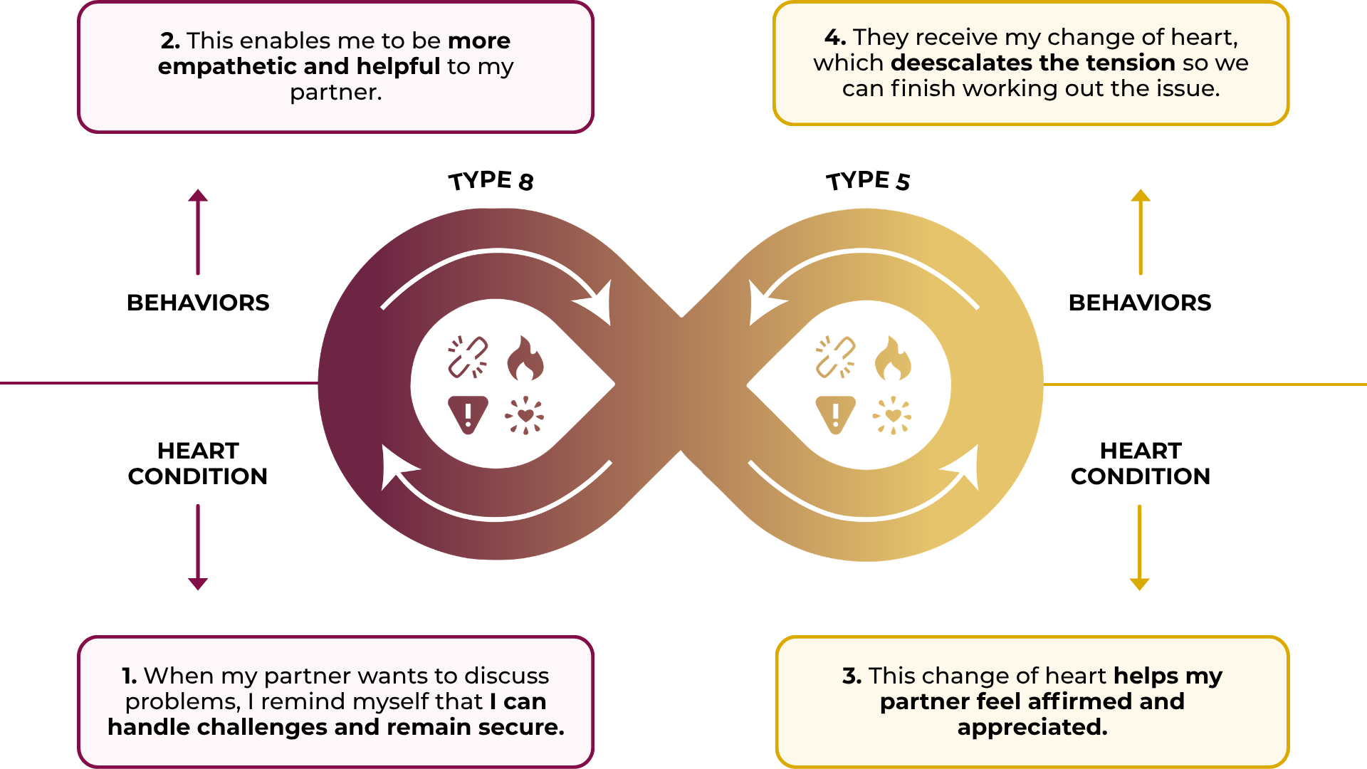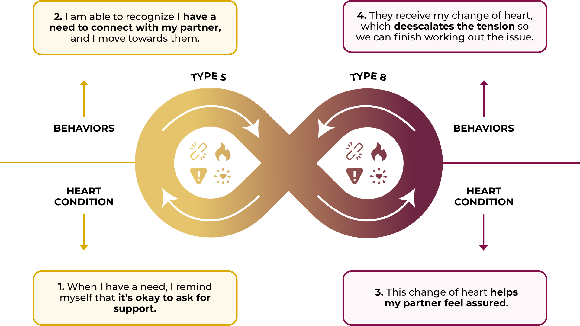 But when we become more aligned with who we are and grow in self-awareness, the dynamic shifts. Here is an example of an aligned dance for Type 5 and Type 8: