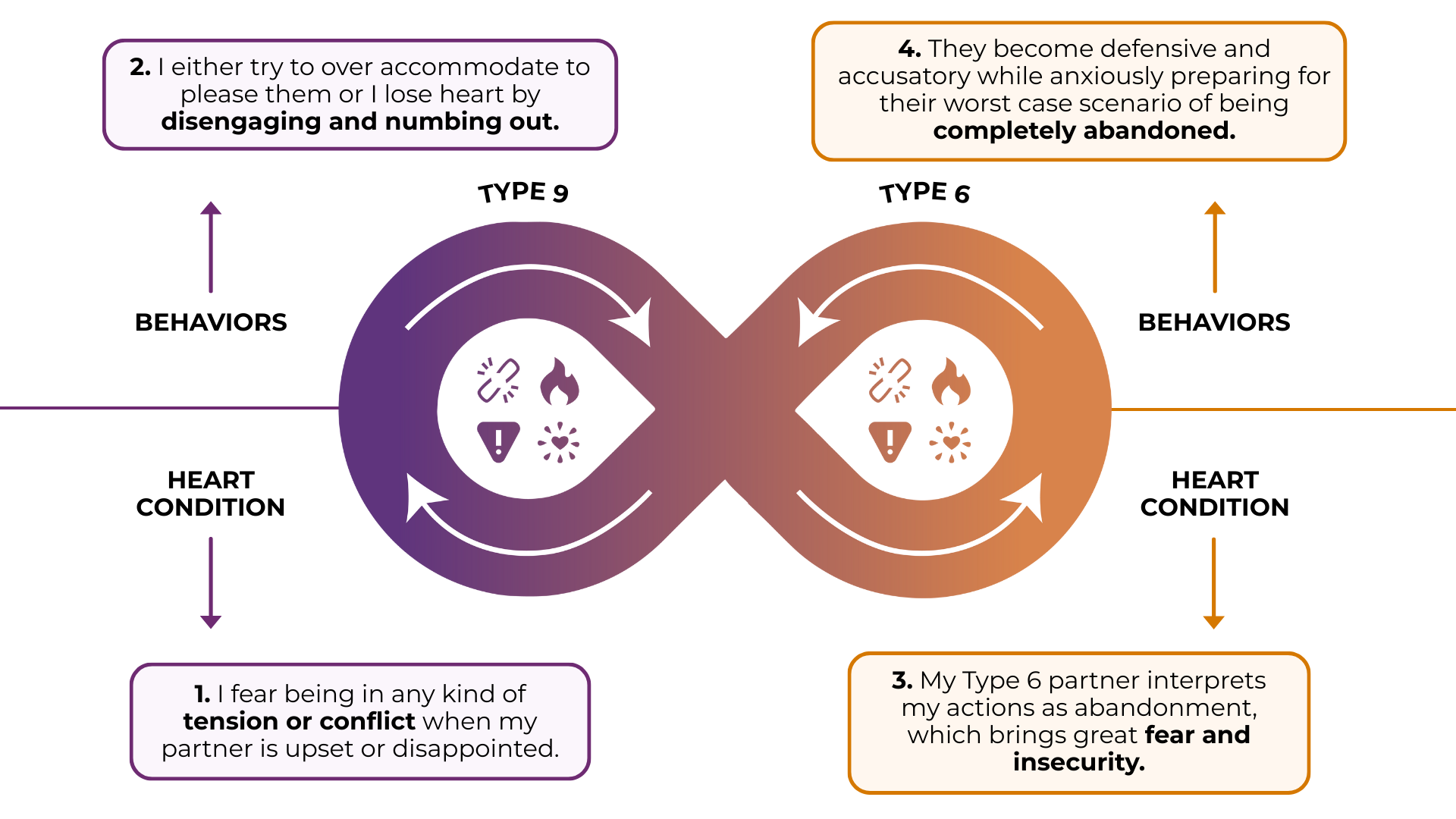 Without awareness, this pairing can slip into a cycle of worry and avoidance, where Type 6's push for clarity and Type 9's retreat further into passivity.