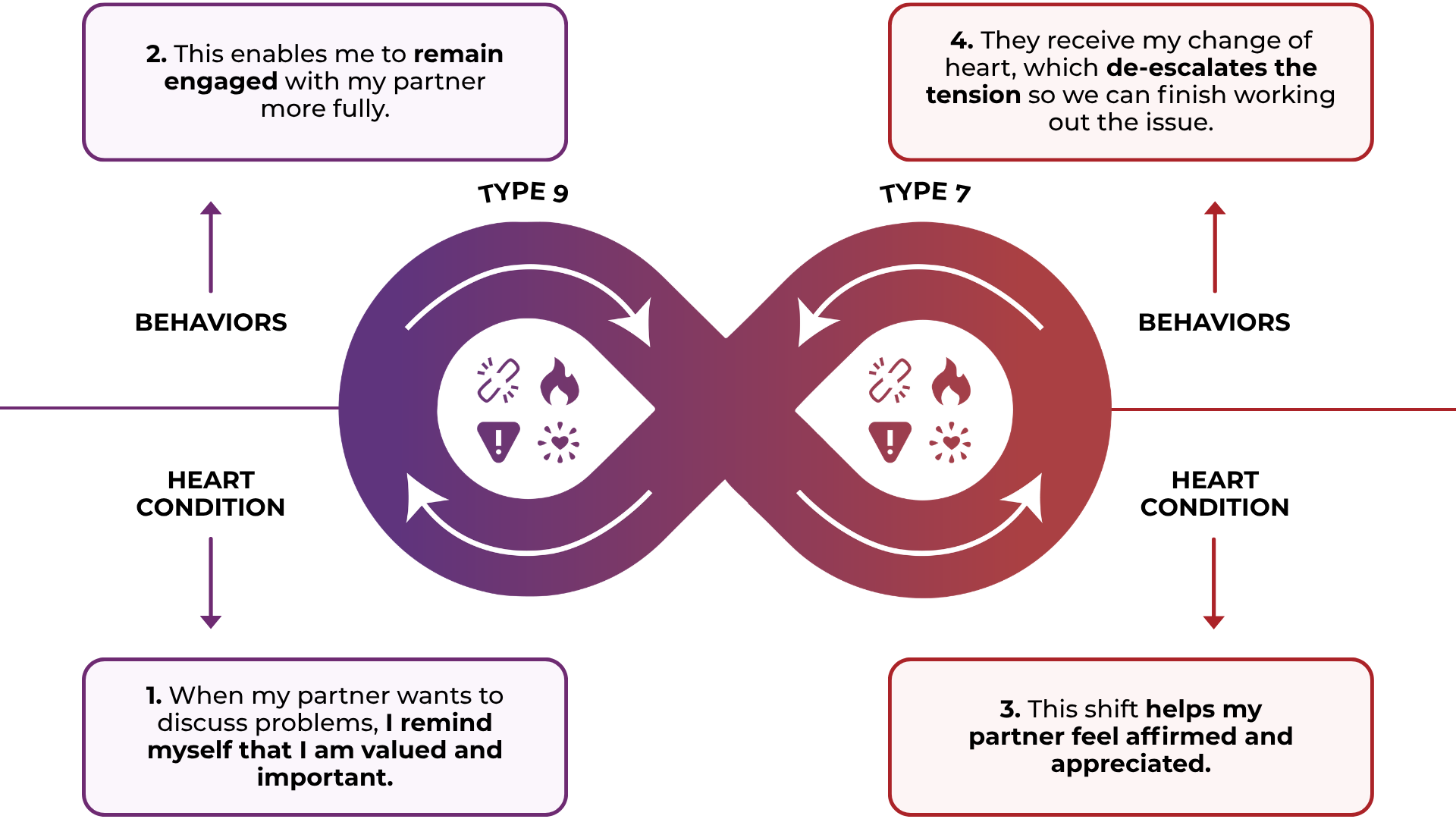 But when we become more aligned with who we are and grow in self-awareness, the dynamic shifts. Here is an example of an aligned dance for Type 9 and Type 7: