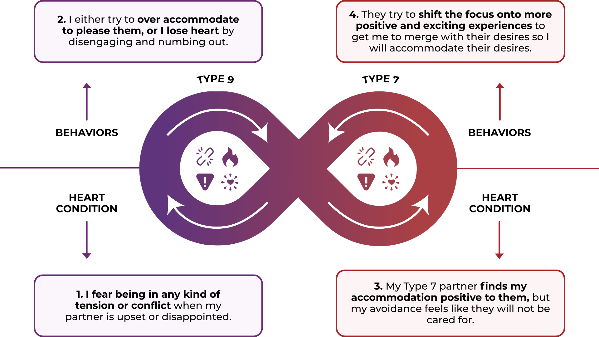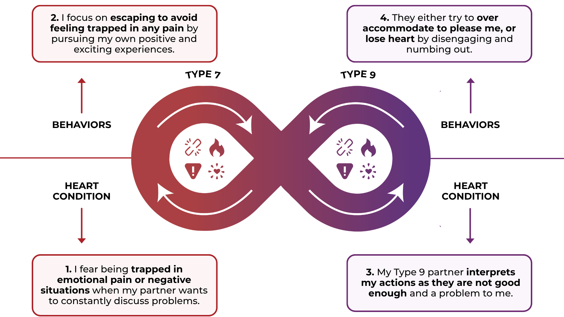 When the Type 7’s need for stimulation meets the Type 9’s tendency to disengage, their struggles may reinforce each other: