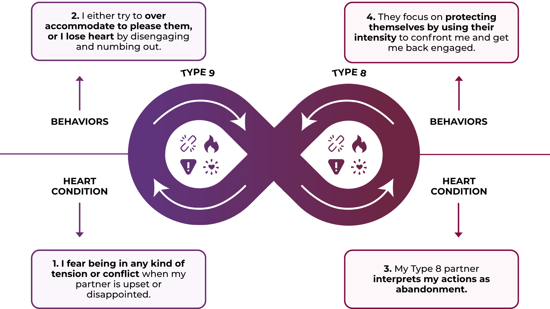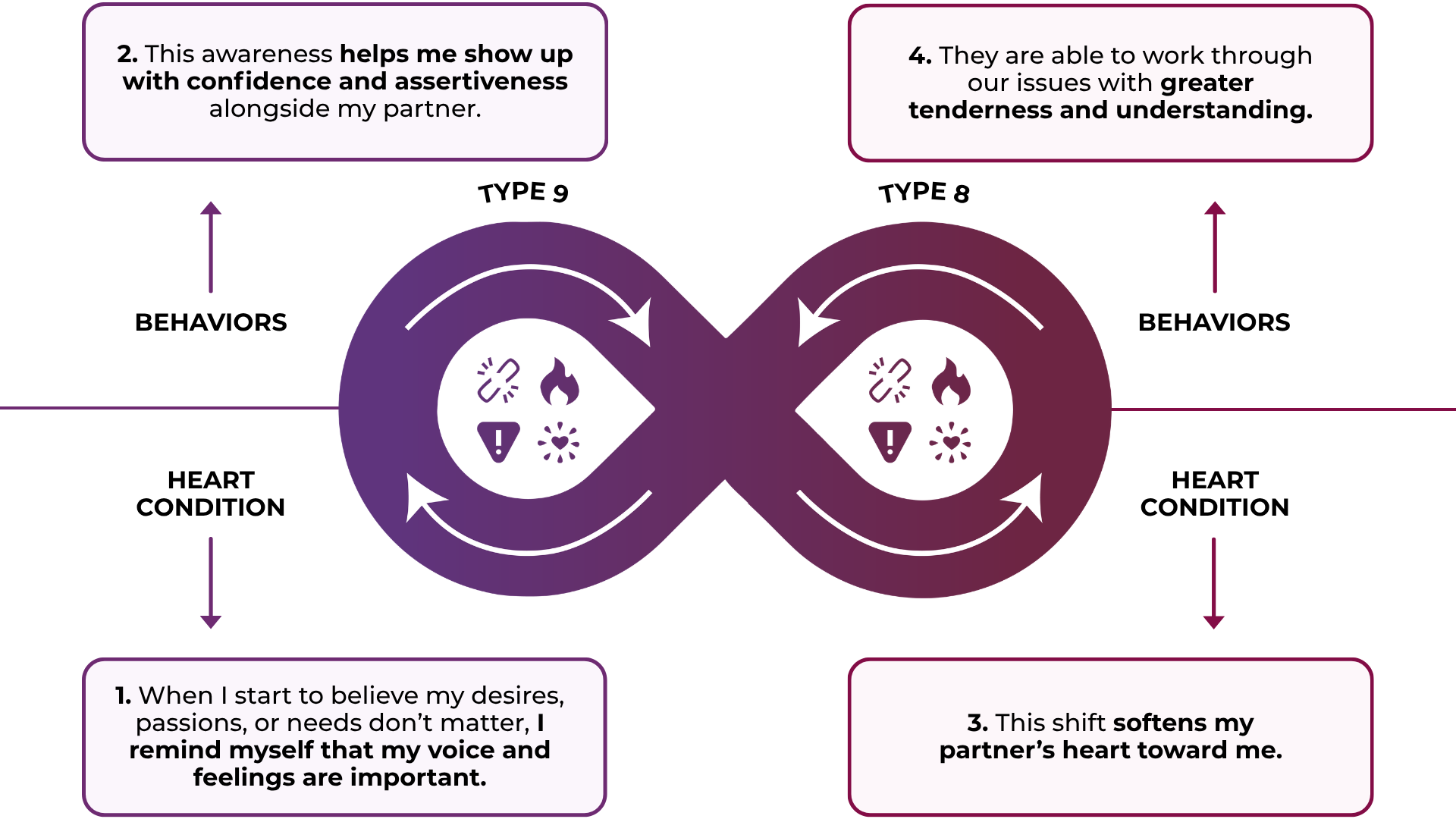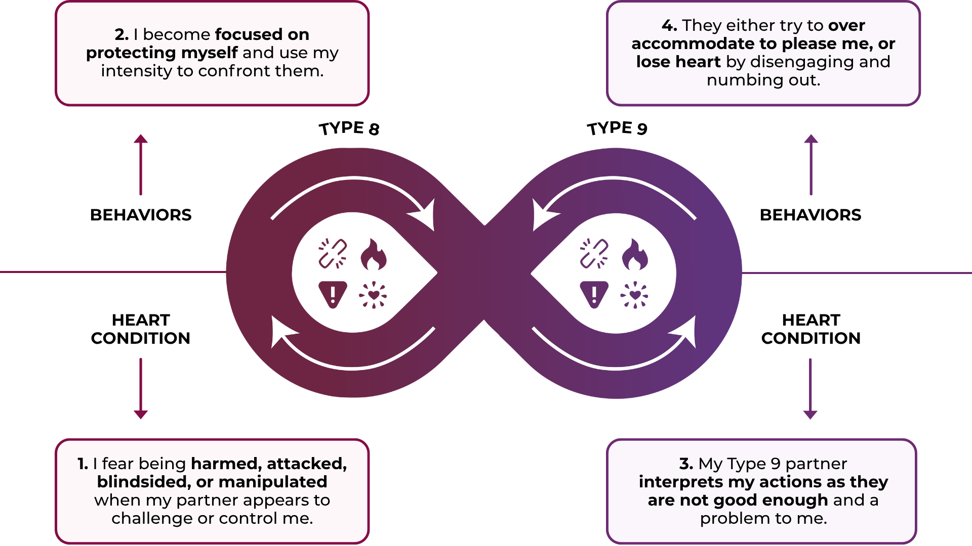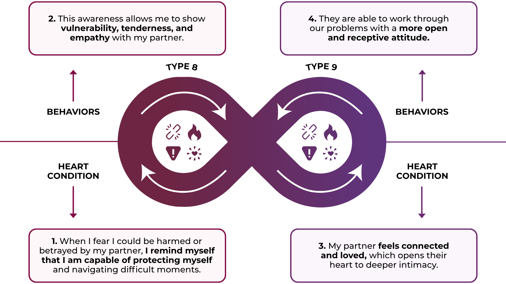 - Stay engaged: Type 9's can resist shutting down, while Type 8's can soften their intensity when tensions rise.